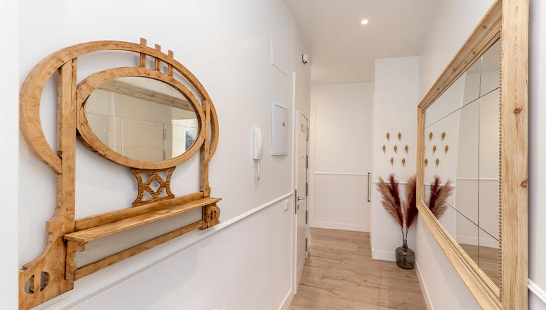 En ParatuReforma recomendamos revestimientos como pinturas satinadas, papeles pintados sutiles o suelos cerámicos brillantes que reflejen luz. Para suelos, también funcionan muy bien los vinilos con patrones longitudinales. Además, los espejos con marcos finos o sin marco pueden ser una excelente opción para multiplicar la luz y crear una sensación de profundidad.