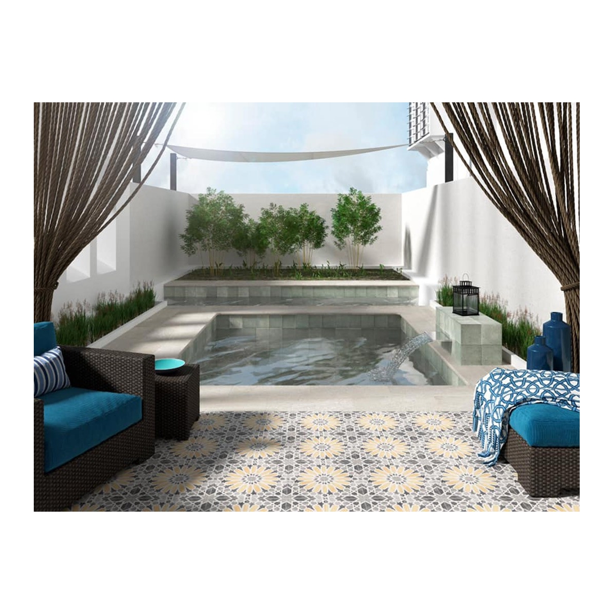 Base decorativa de la serie Davalos de Mainzu, perfecto para interiores y exteriores, modelo tipo imitación hidráulico. Perfectamente combinable con el resto de bases de la serie. Fabricado en porcelánico en formato 20x20 antideslizante clase 2, cajas de 1m2 con 25 piezas por caja, acabado mate. También puede ser utilizado como revestimiento.