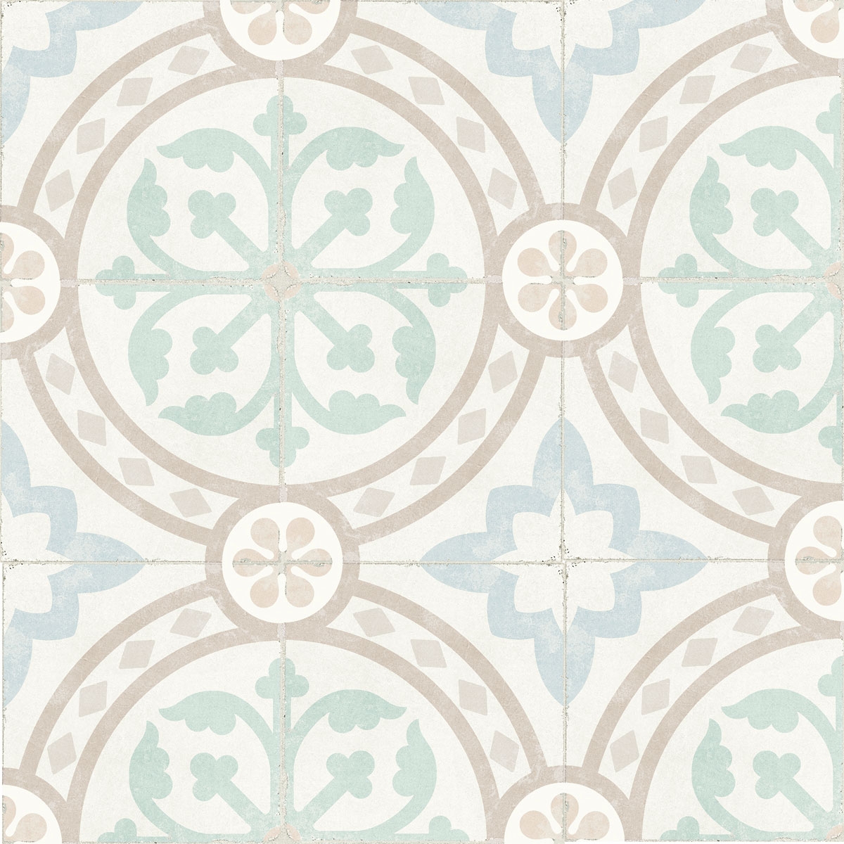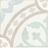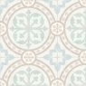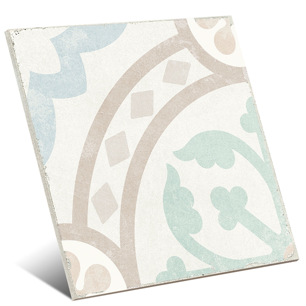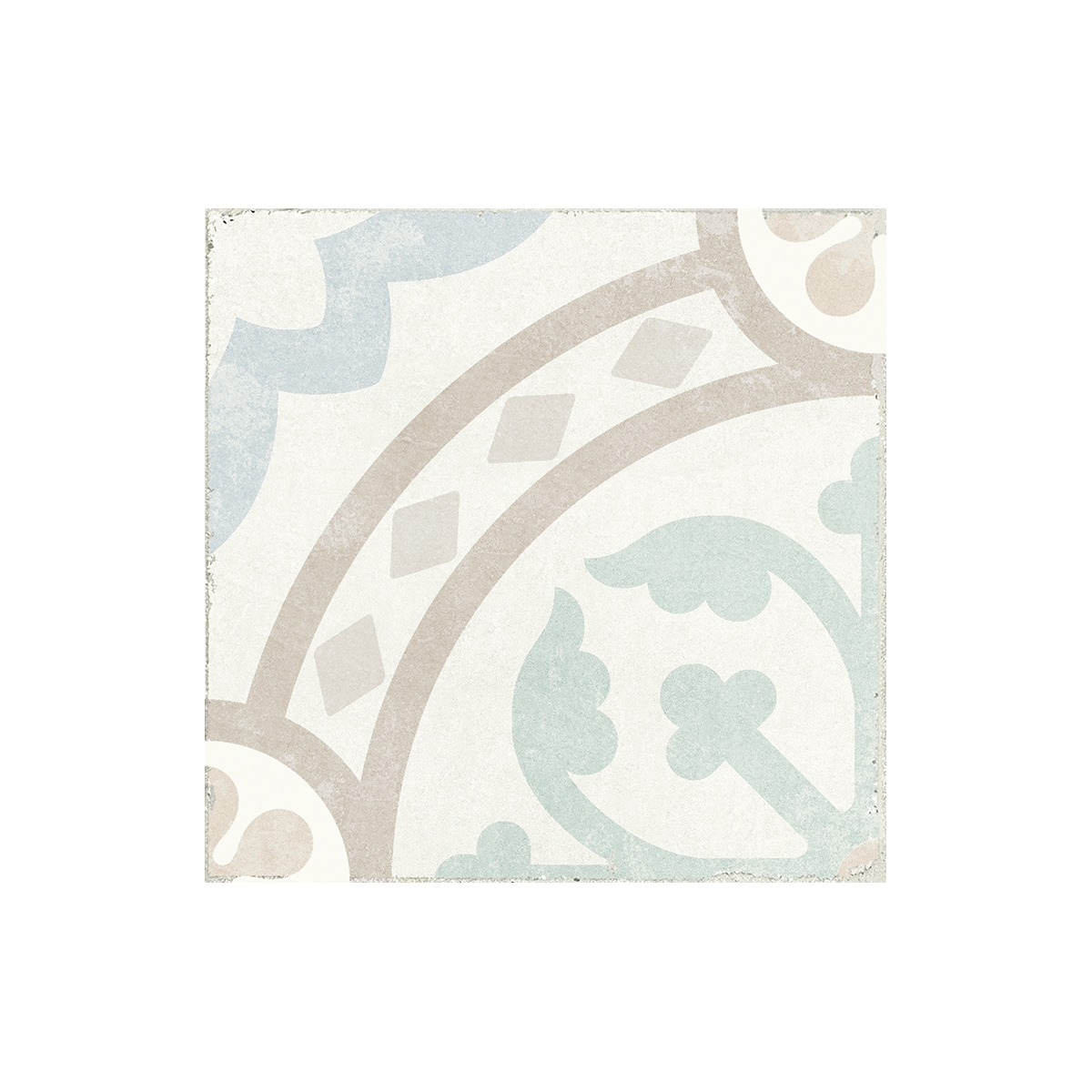 Azulejo porcelánico de aspecto hidráulico tradicional, formato 20×20cm, en delicadas tonalidades blanco, azul y coral de aspecto desgastado.