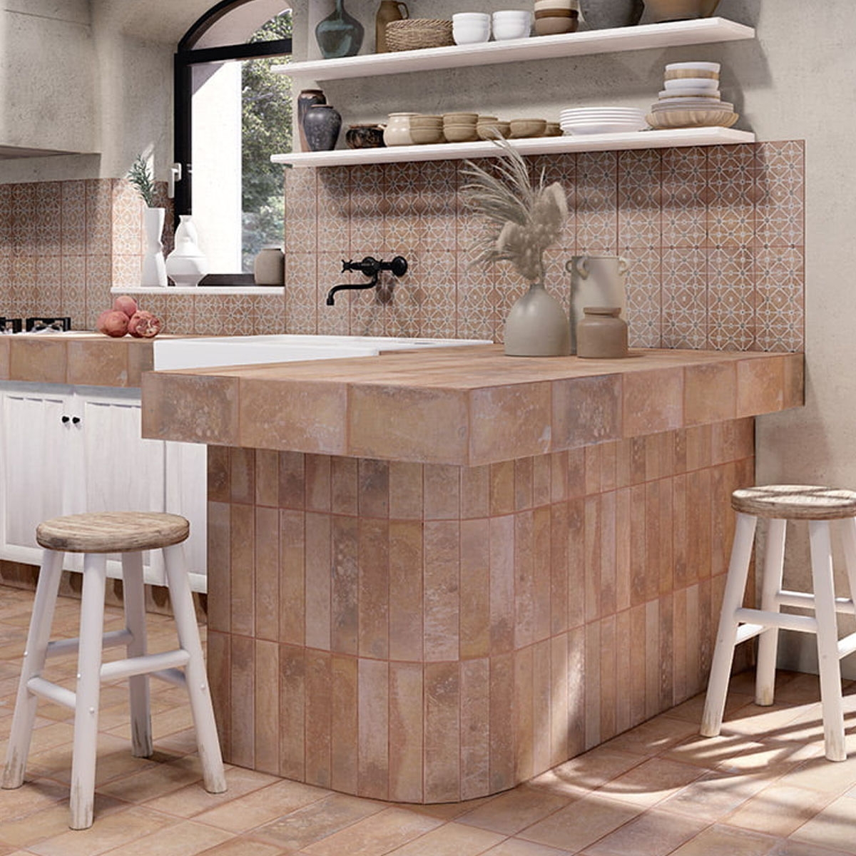 Its soft pink hue evokes warmth, creating a relaxing and cozy atmosphere, perfect for spaces such as bathrooms, kitchens or living rooms.