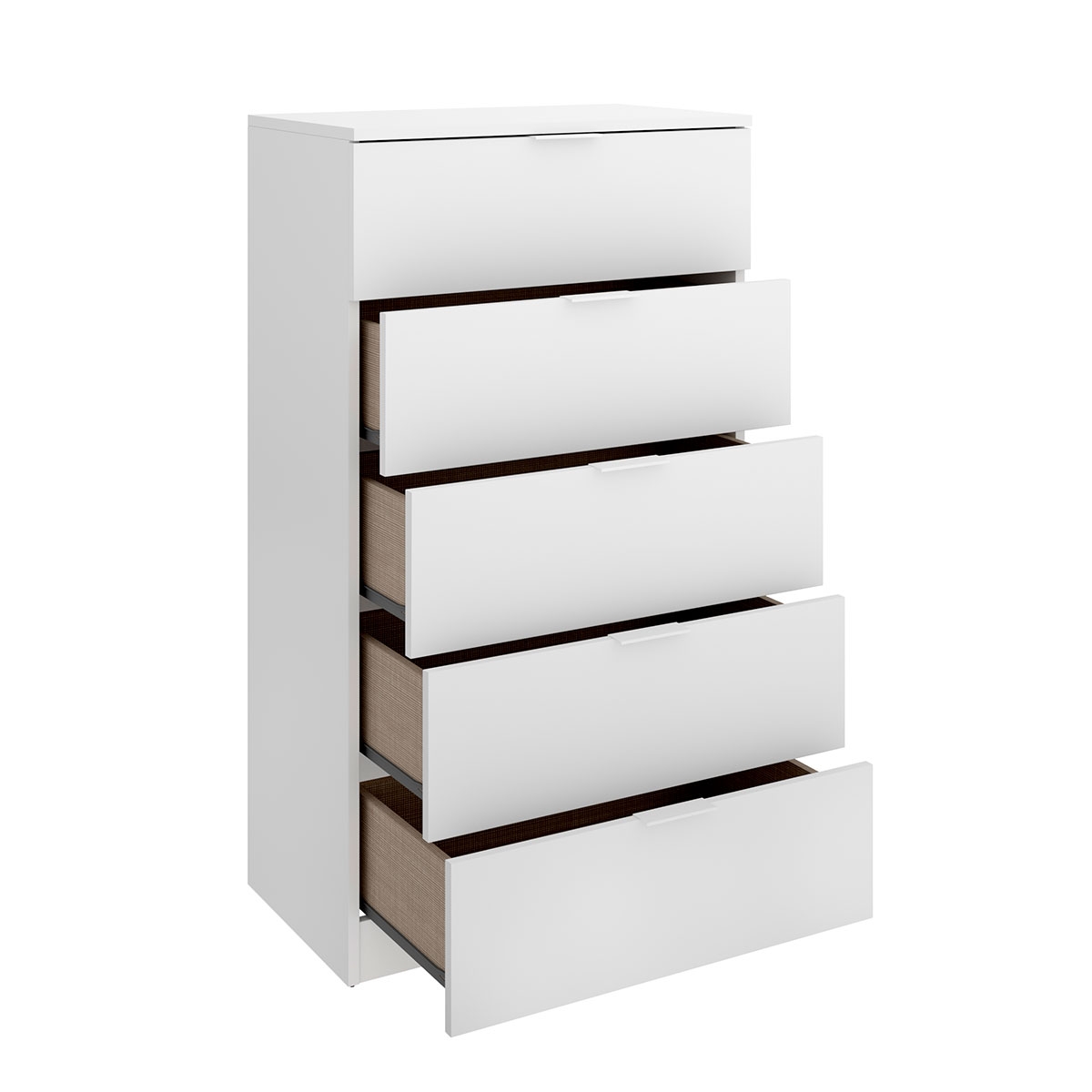 It has five large drawers with smooth sliding metal guides and textile finish inside, providing an ideal space to organize clothes or other objects. In addition, it has anti-scratch and noise-resistant ABS legs, protecting the floor and ensuring stability.