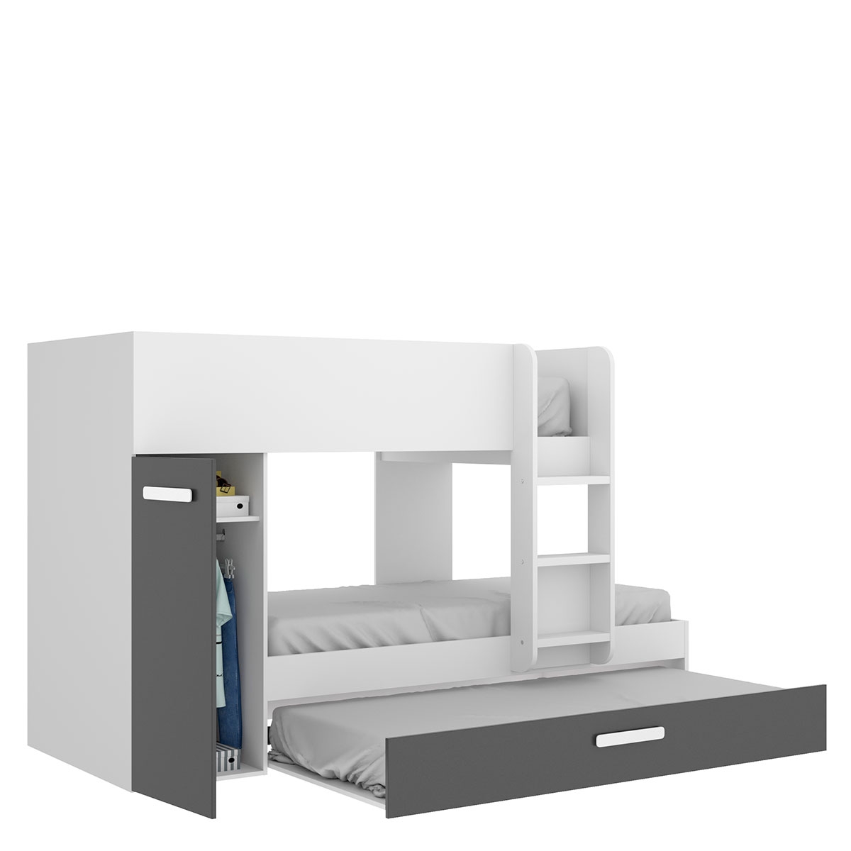 The Tom Train Bed 3 Beds Tom White/Graphite from Dekit is the ideal choice for those looking to maximize space in small rooms without sacrificing style or functionality.