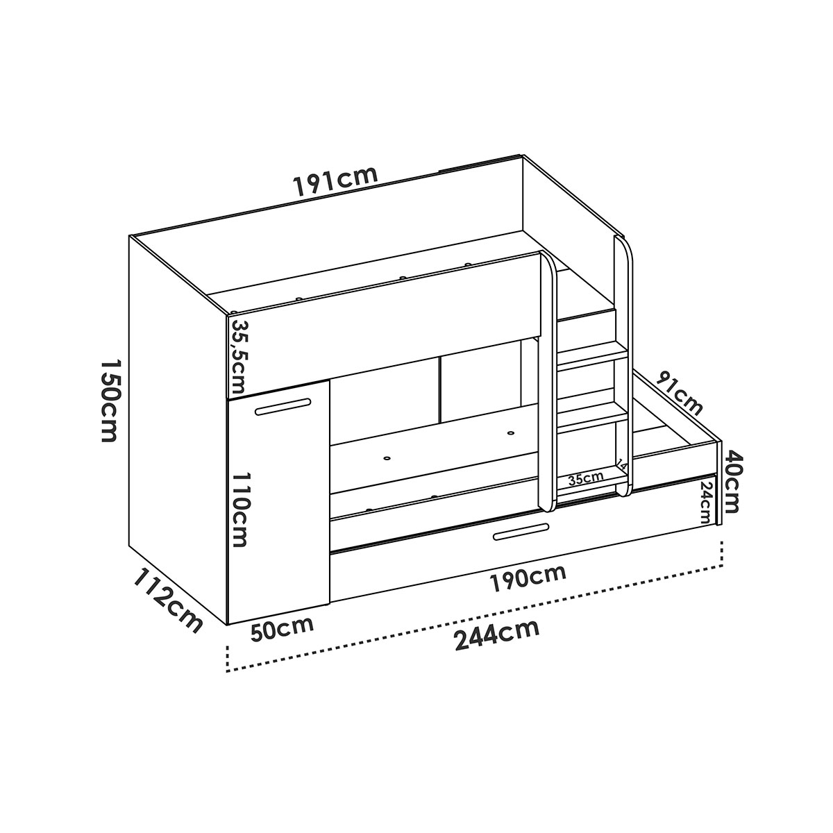 With tres beds arranged vertically, it allows you to make the most of the available area, making it an excellent solution for families with several children, holiday homes or shared rooms.