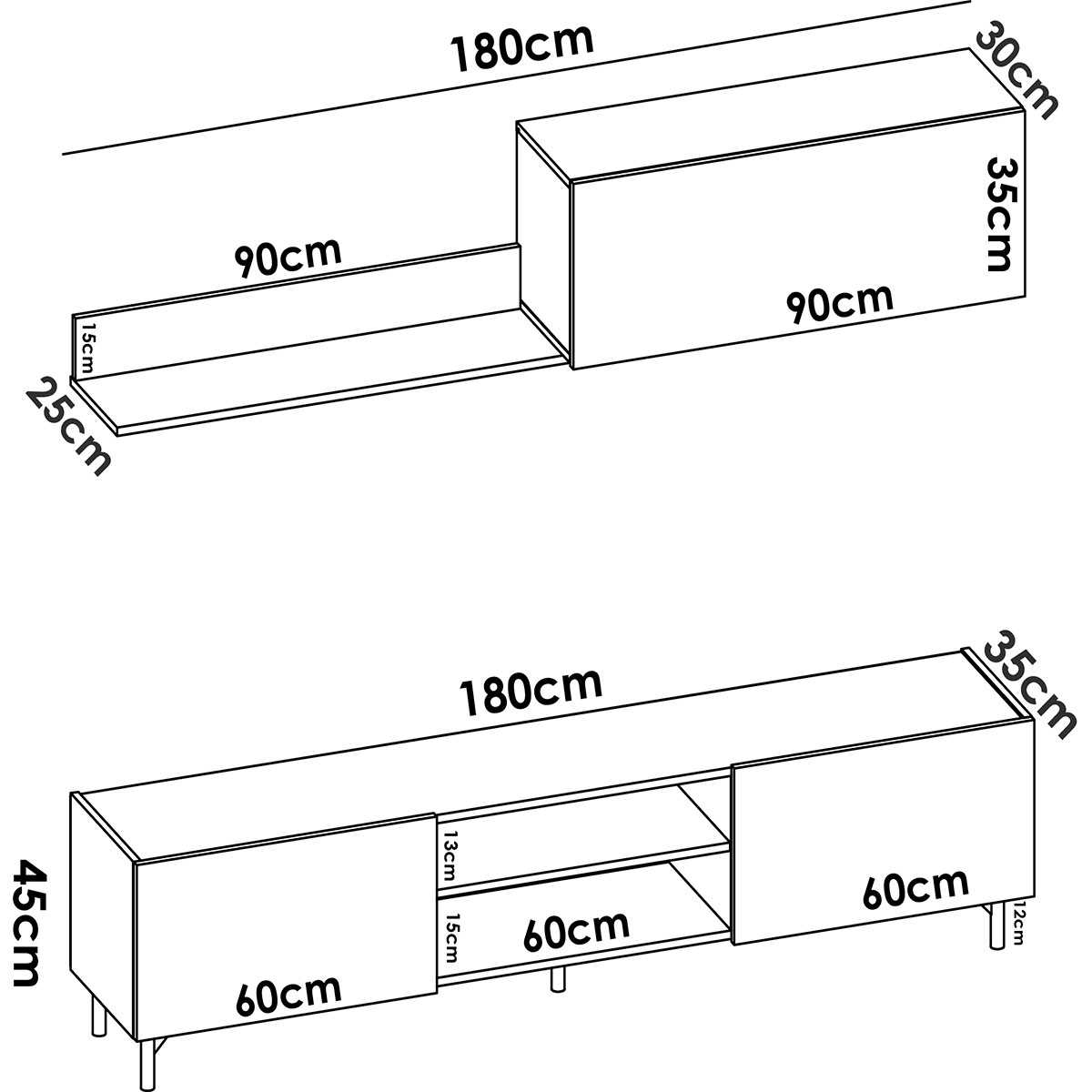The TV stand is 180 cm wide, 45 cm high and 35 cm deep, with two doors and open compartments for electronic equipment. The upper module, with 180 cm wide, 35 cm high and 30 cm deep, includes a hinged door with a gas compass and an open shelf.