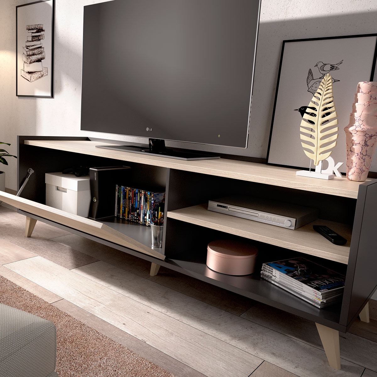 With a two-tone finish, graphite and natural, this furniture fits perfectly in any modern or contemporary environment. Specially designed to support TVs up to 55 inches, it has ample storage spaces.