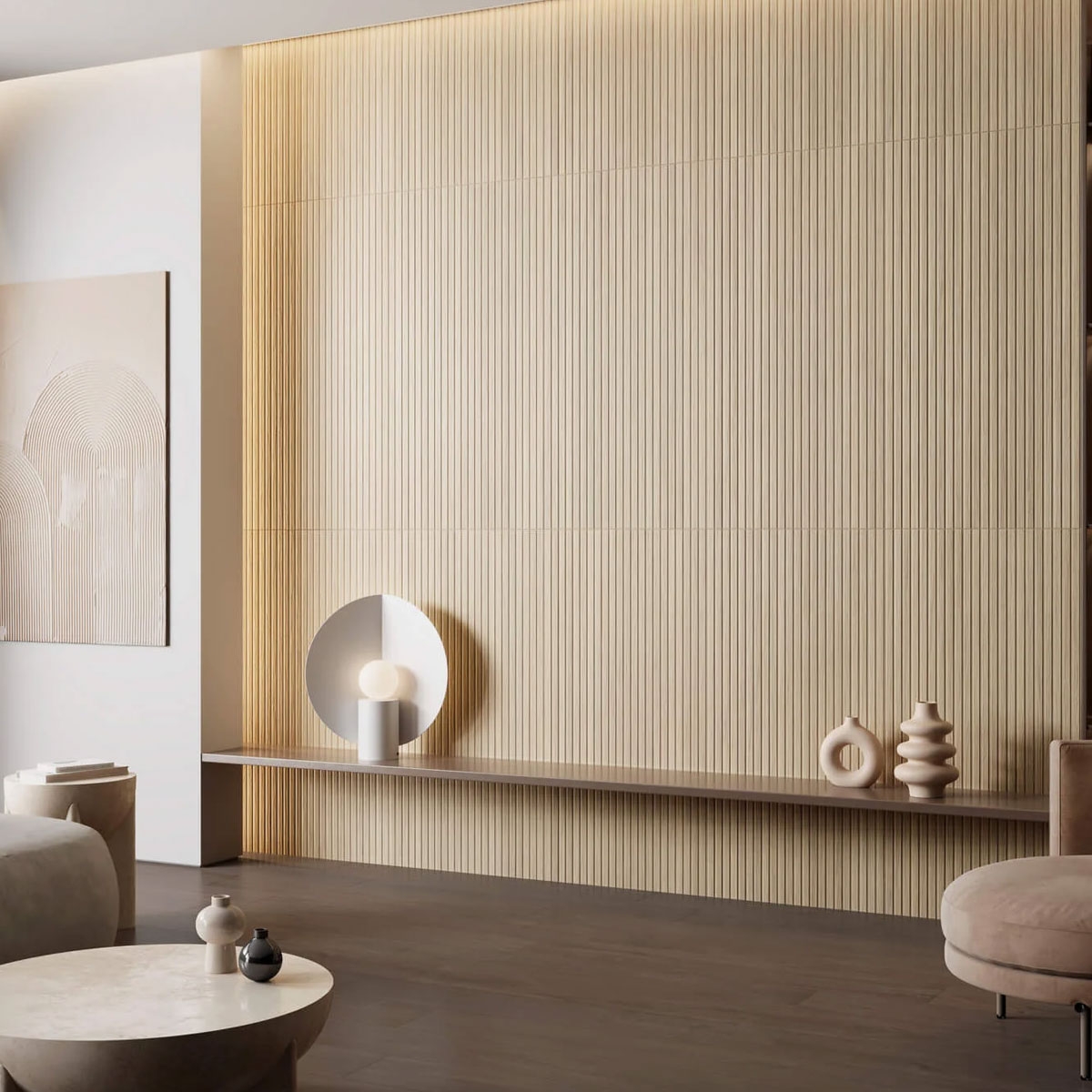 Its natural finish with a slatted texture and sand tone creates a cozy and contemporary atmosphere, perfectly adapting to Scandinavian, Mediterranean or minimalist styles.