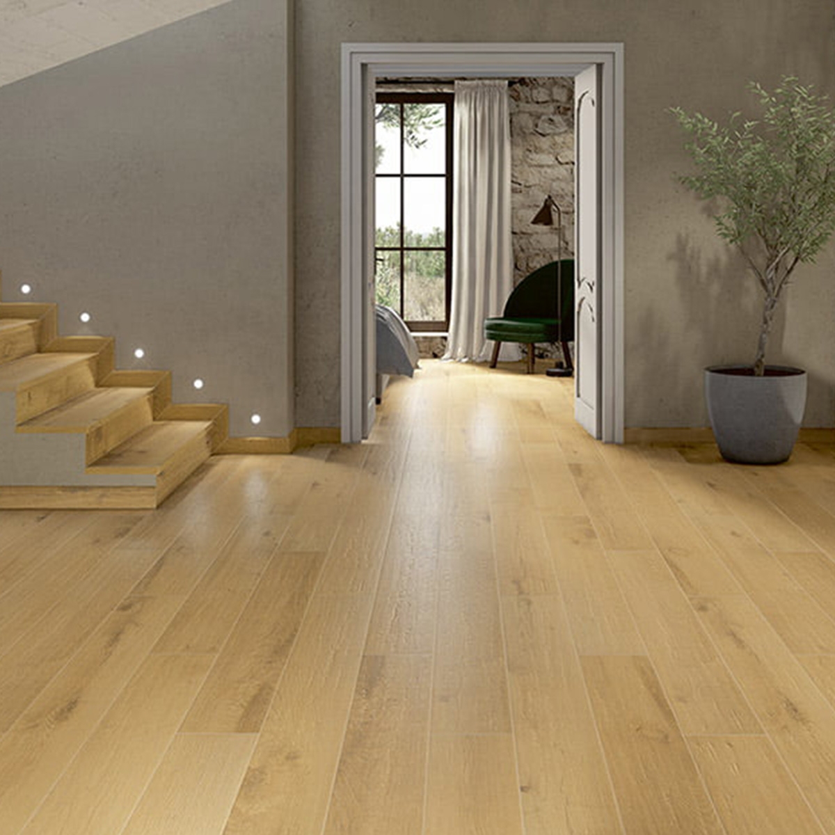 Ce format de lattes allongées, 20x120 cm, permet une installation élégante, avec un grand réalisme visuel et une continuité dans la conception du sol. Grâce à son procédé de fabrication par extrusion, il offre une surface au relief et à la personnalité, propre à chaque pièce.