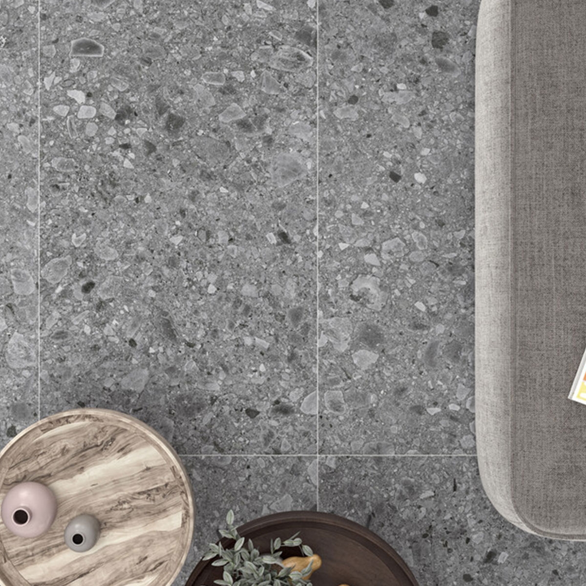 La couleur grise de la dalle, polyvalente et intemporelle, s’adapte à différents styles de décoration, des environnements minimalistes aux environnements plus chaleureux et confortables.