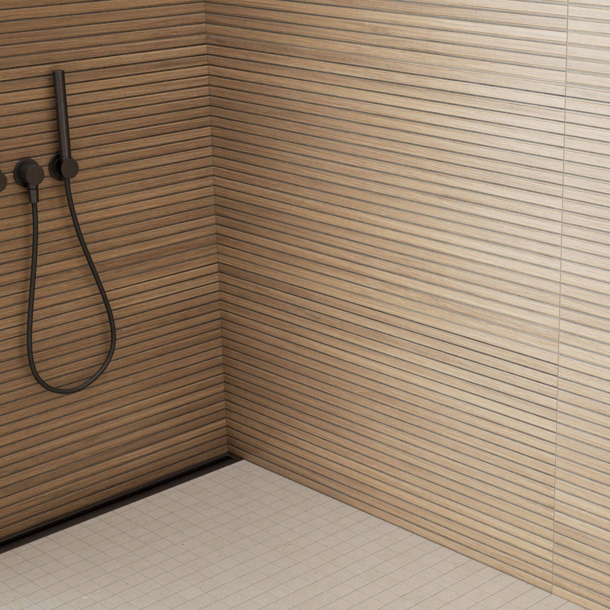 Le revêtement Osaka Teak-Nero 60x120 de Durstone allie design sophistiqué et fonctionnalité dans une proposition qui simule l’élégance du bois naturel.