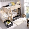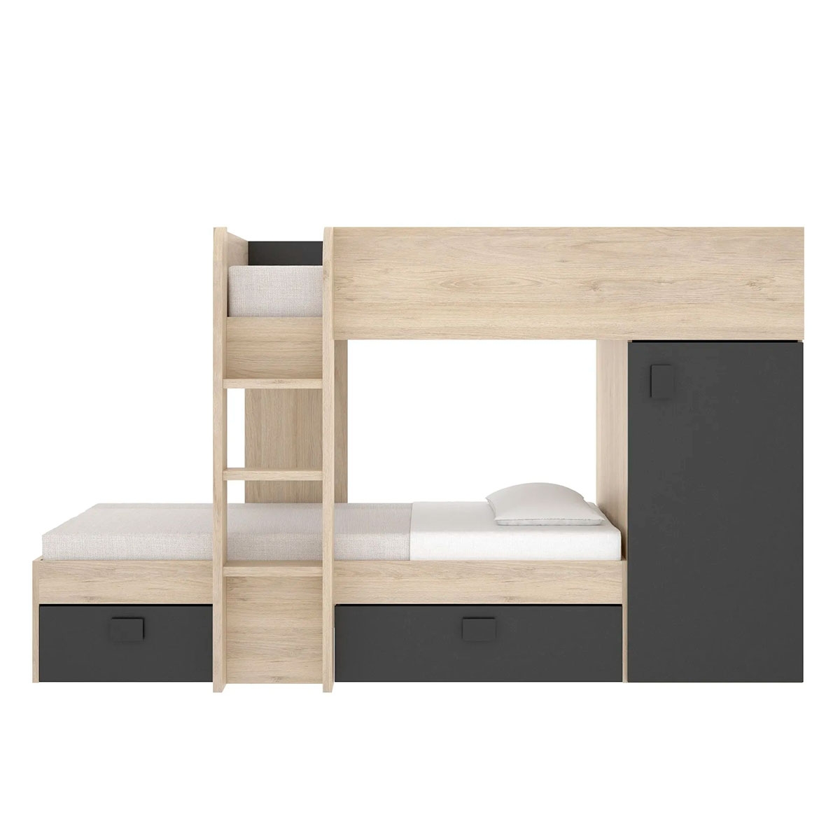 Sa structure comporte deux lits disposés en train, le lit supérieur étant accessible par un escalier robuste. Fabriqué en panneau de mélamine haute densité, il combine une finition dans les tons naturels et le graphite, offrant un style contemporain et élégant.