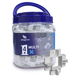 Le Multi X 4x est un intercalaire multiple qui permet d’utiliser 4 tailles (1,2,3 et 5 mm) d’épaisseur dans la même pièce. Ils sont conçus de manière ergonomique pour une utilisation confortable et facile, ce qui vous permet de choisir rapidement et efficacement l’épaisseur souhaitée. Fabriqué dans un matériau résistant de haute qualité, il s’agit d’une pièce récupérable et réutilisable. La traverse Multi Series de Peygran est fabriquée dans un matériau très résistant, elle est également renforcée et préparée pour résister aux dalles lourdes. Chaque boîte contient 60 unités de traverses aux dimensions de 1,2, 3 et 5 mm réutilisables pour tout type de travail.