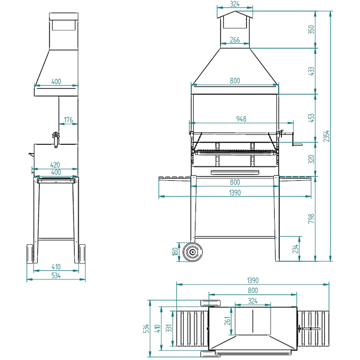 <ul style="list-style-type:circle;"><li><b>Feito de aço até 4 mm</b></li> <li><b>Tinta anti-calor preta: 800 ºC (não antioxidante) em caixa de brasa </b><b>e para-brisas</b></li> <li><b>Tinta epóxi sem ferrugem (exceto gavetas de brasa e corta-ventos)</b></li> <li><b>Inclui grelha em aço inoxidável e coletor de graxa, ajustável em altura</b></li> <li><b>Inclui grelhador de ferro fundido</b></li> <li><b>Inclui gaveta de cinzeiro</b></li> <li><b>Inclui para-brisas e campainha</b></li> </ul>