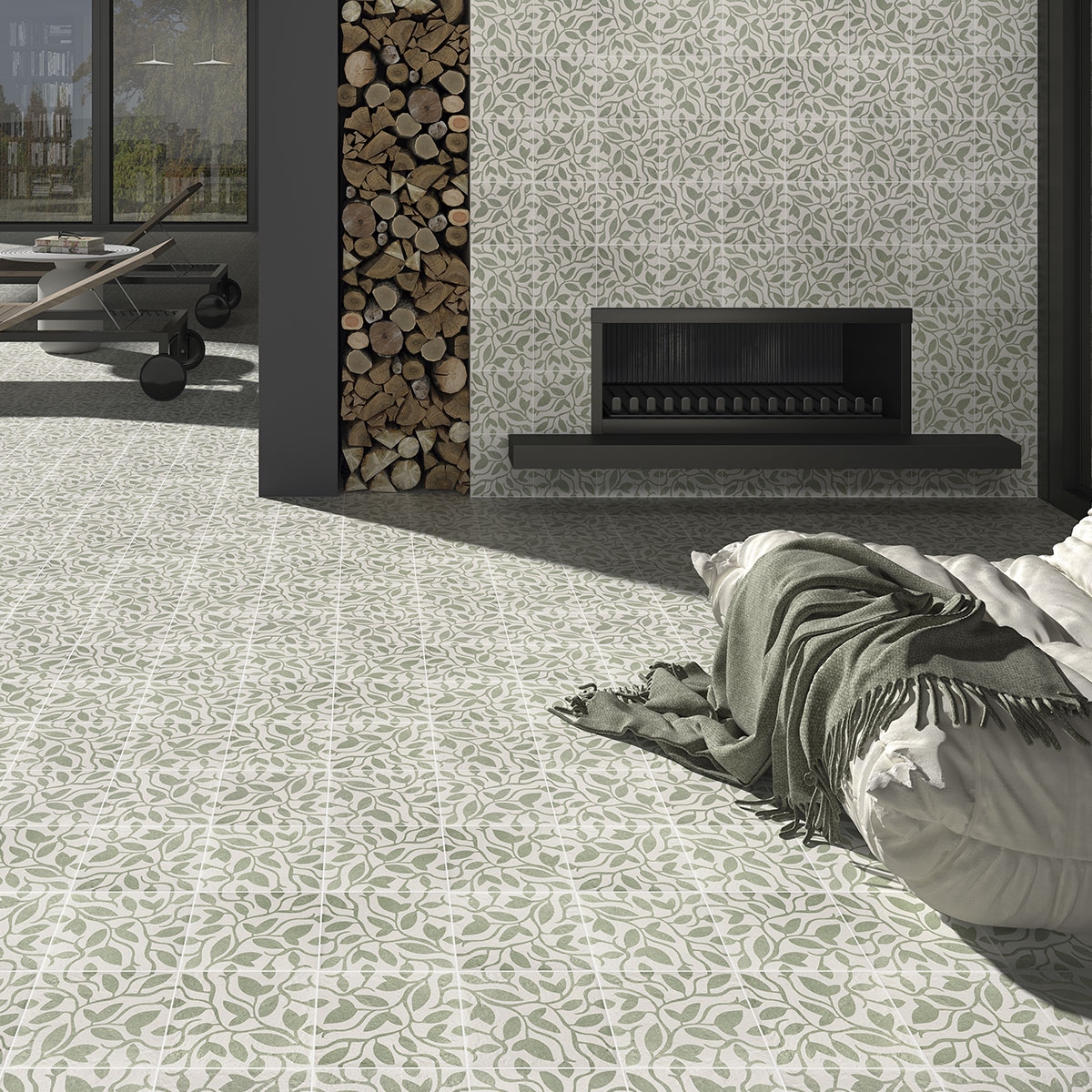 O Green Garden Decor Green Five 20x20 by Mainzu é um porcelanato com acabamento mate que se destaca pelo seu design geométrico em tons de verde e branco. Ideal para revestimento interior e exterior, incluindo áreas de piscina.