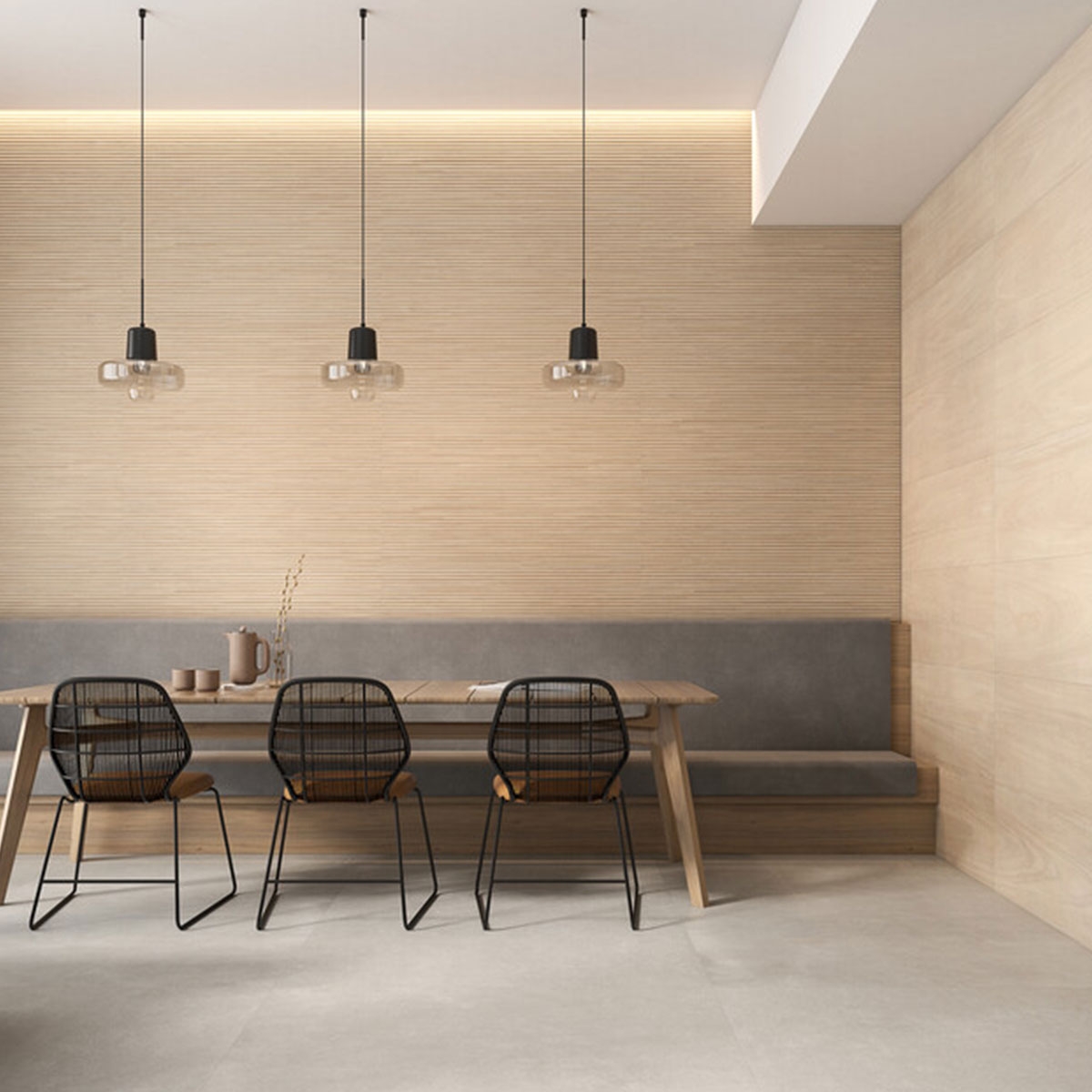 Ideal para interiores, é perfeito para uso em pisos e paredes em salas, cozinhas, banheiros ou corredores. O seu grande formato de 40x120 cm não só proporciona um design elegante e contínuo, como também facilita a instalação, reduzindo as juntas visíveis.